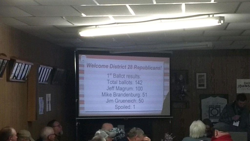 In February, when District 28 Republicans held their endorsing convention, Magrum came out on top as the leading vote getter (100 votes). Brandenburg edged Grueneich by one vote (51-50). (As a side note, incumbent State Senator Robert Erbele went unchallenged for the Senate endorsement.) You can see the House totals below: